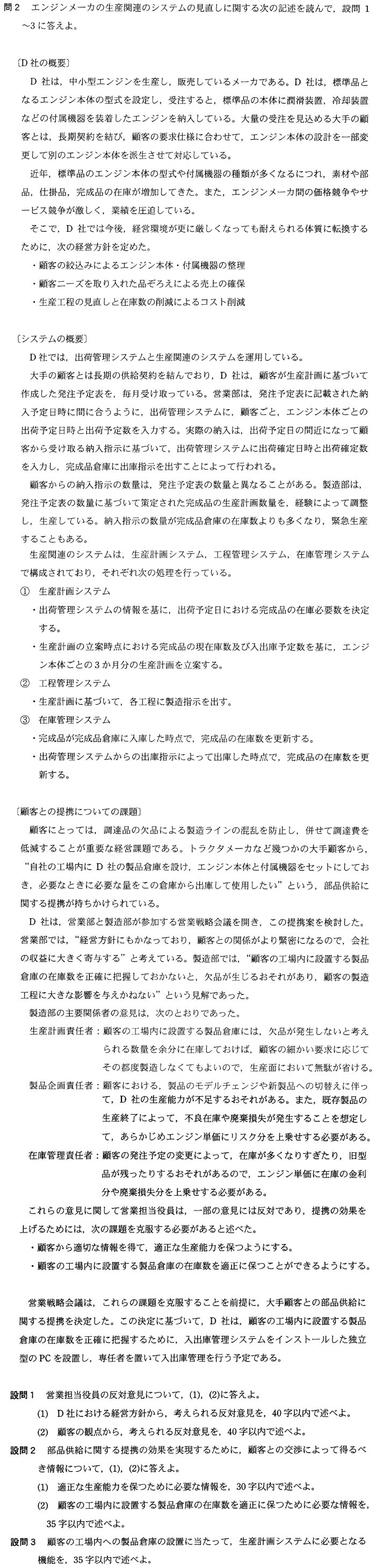 平成22年度秋期午後Ⅰ【問2】 X Facebook LINE 2024.04.282024.05.19 設問1解答例 (1) 顧客の工場内に在庫する数量を多くすると,D 社の在庫の削減にはならない。 (2) エンジン単価を高く設定すると,顧客にとって調達費の低減にならない。 設問2解答例 (1) モデルチェンジの予定情報や新製品の開発情報 (2) 顧客の生産計画が確定した時点の,D 社製品の日別出庫数の情報 設問3解答例 製品倉庫の入出庫管理システムの在庫数の情報を取り込む機能