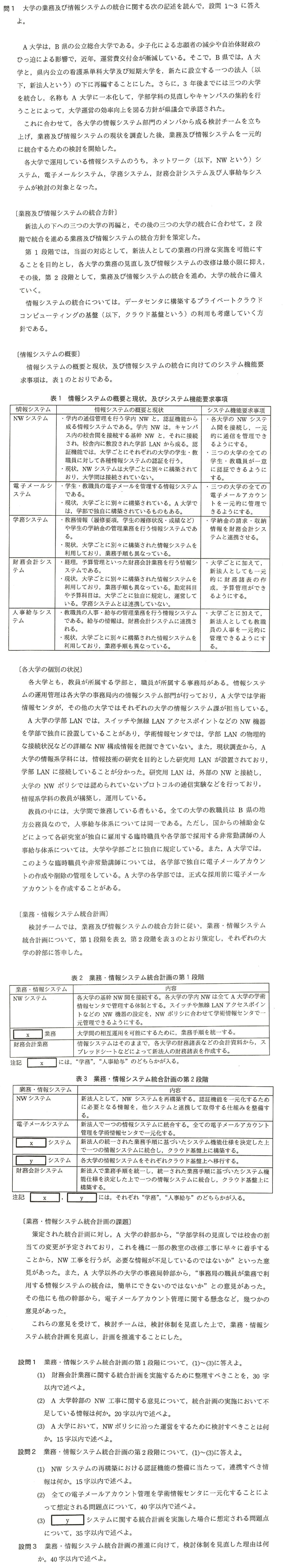 平成28年度秋期午後Ⅰ【問1】 X Facebook LINE 2024.04.282024.05.19 設問1解答例 (1) 新法人の財務諸表と各大学の勘定科目,予算科目間の対応 (2) 学部 LAN の詳細な NW 構成情報 (3) 研究用 LAN の運用方法 設問2解答例 (1) 人事給与システムの人事情報 (2) A 大学の臨時職員や非常勤講師の電子メールアカウントを適時に発行できない。 (3) 業務が統一されず,教務情報や学納金の管理業務が複雑になる。 設問3解答例 業務手順の検討には,情報システム部門以外の事務局の職員の参加が必要だから