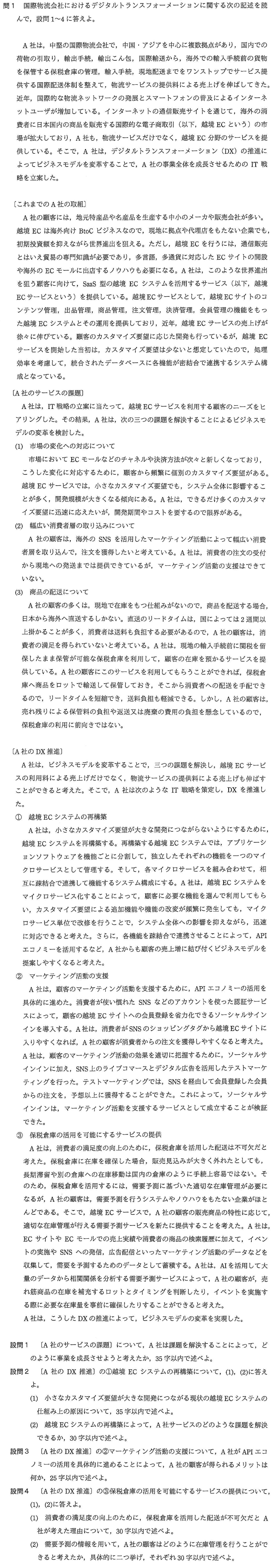 令和04年度春期午後Ⅰ【問1】 X Facebook LINE 2024.04.282024.05.19 設問1解答例 越境 EC サービスと物流サービスの両方の事業の売上げを成長させる。 設問2解答例 (1) 統合されたデータベースに各機能が密結合で連携するシステム構成 (2) 顧客からの頻繁なカスタマイズ要望に迅速に応えること 設問3解答例 SNS 経由の消費者からの注文を獲得しやすくなる。 設問4解答例 (1) リードタイムを短縮でき,消費者の送料負担も軽減できるから (2) ①・売れ筋商品の在庫を補充するロットとタイミングを判断する。②・イベントを実施する際に必要な在庫量を事前に確保する。