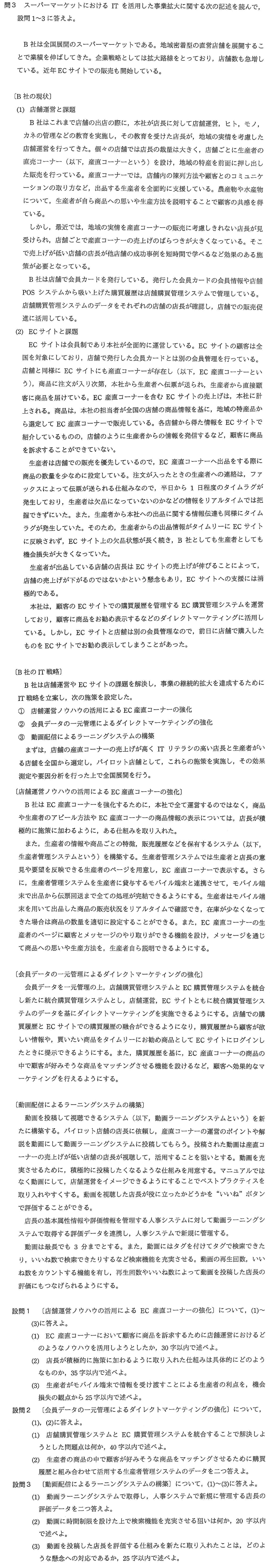 令和04年度春期午後Ⅰ【問3】 X Facebook LINE 2024.04.282024.05.19 設問1解答例 (1) 生産者が自ら商品への思いや生産方法を説明すること (2) EC 産直コーナーの売上げは各店舗の売上げに反映されるようにした。 (3) 在庫が少ない商品をすぐに出品できる。 設問2解答例 (1) 前日に店舗で購入したものを EC サイトでお勧め表示してしまうこと (2) ①・生産者の情報②・商品ごとの特徴 設問3解答例 (1) ①・投稿した動画の再生回数②・投稿した動画のいいね数 (2) 短時間で学べるようにするため (3) 店長が動画を投稿しようと思わない懸念